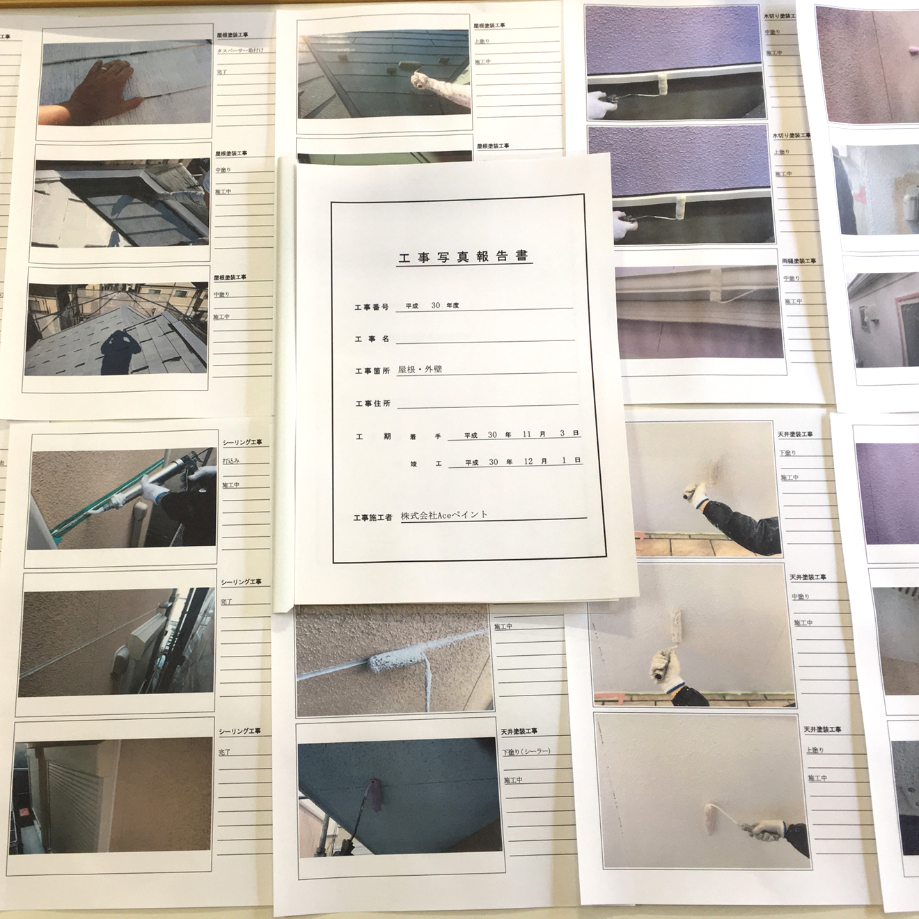 どんなに実績がある会社だとしても留守中や、見ていない所で作業をされるのは怖いし不安…、このように思う事は当然のことでしょう。株式会社Aceペイントではこのように思うお客様にも安心していただけるように作業中の工程写真を整理してまとめた報告書を作成し、工事終了後にお渡ししております。